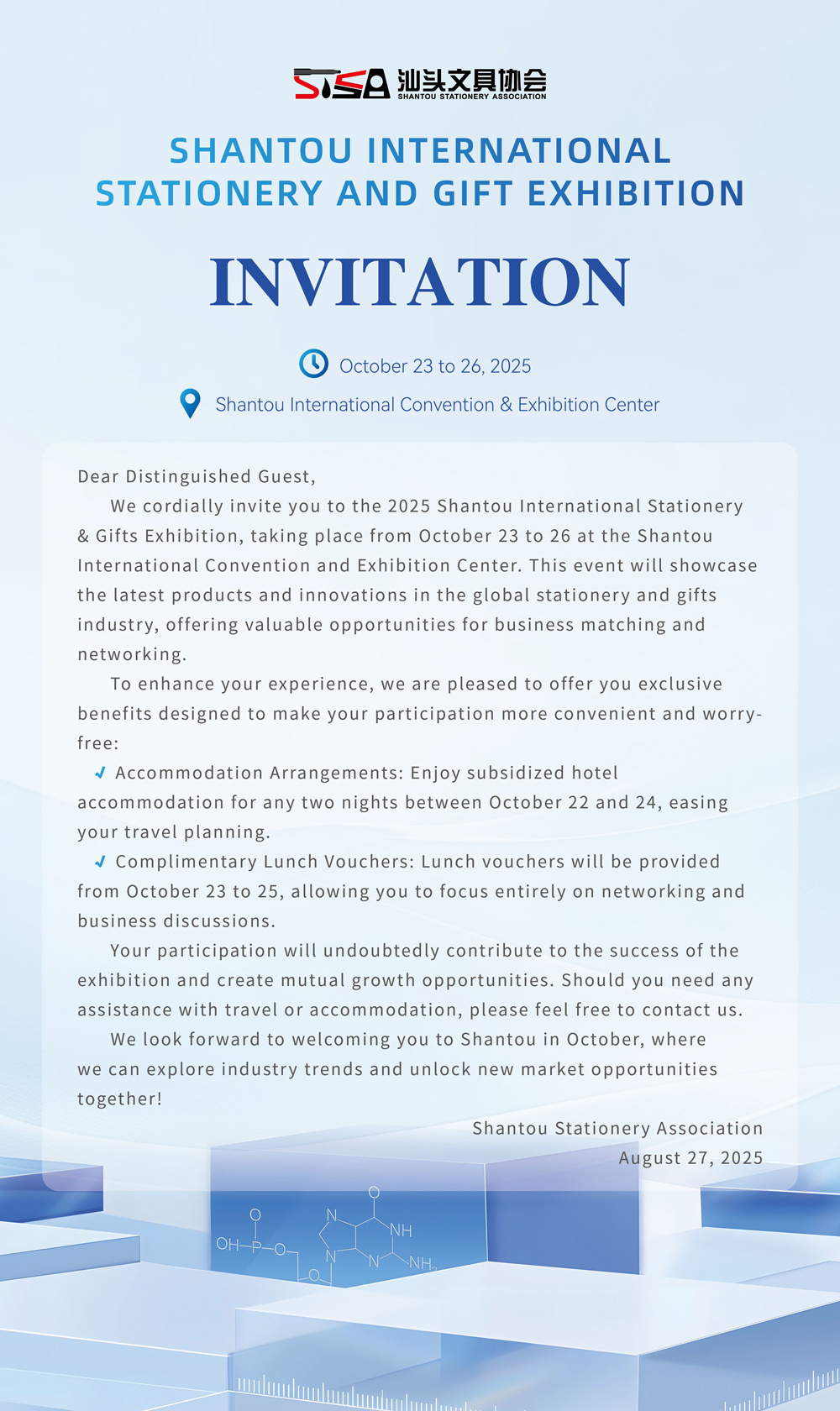 We cordially invite you to the 2025 Shantou International Stationery & Gift Exhibition, taking place from October 23 to 26 at the Shantou International Convention and Exhibition Center.